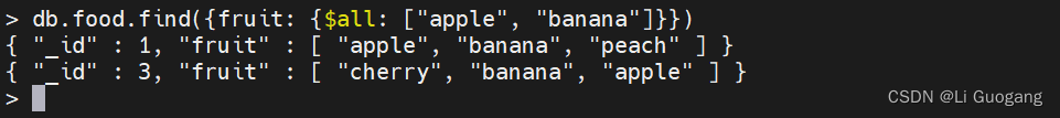 可以使用 “$all” 查询来找到同时包含元素 “apple” 和 “banana” 的文档: