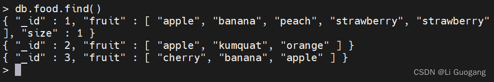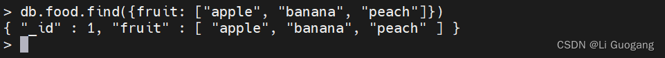 > db.food.find({fruit: ["apple", "banana", "peach"]})