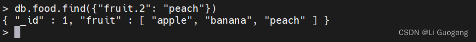 > db.food.find({"fruit" : ["banana", "apple", "peach"]})如果想在数组中查询特定位置的元素,可以使用 key.index 语法来指定下标: