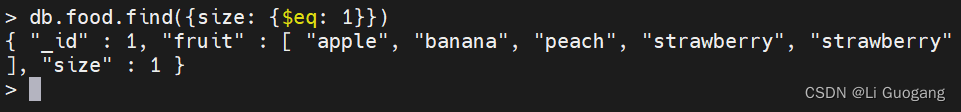 这里的顺序无关紧要。注意,上面第二个结果中的 “banana” 在 “apple” 之前。如果在" a l l " 中使用只有一个元素的数组,那么这个效果和不使用 " all" 中使用只有一个元素的数组,那么这个效果和不使用 " all"中使用只有一个元素的数组,那么这个效果和不使用"all" 是一样的。例如,{fruit : {$all : [‘apple’]} 和 {fruit : ‘apple’} 会匹配相同的文档。
