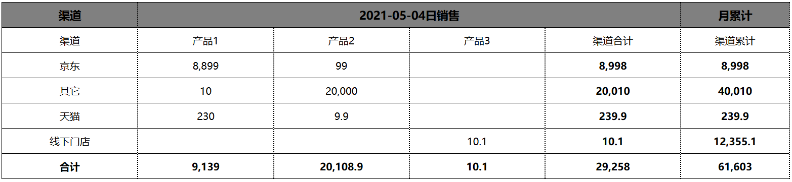 如果你看到這裏請稍稍思考下,一開篇我説過我們的數據是按 日期|产品|渠道|销售额 這樣按行存儲的,以上截圖大家一看就懂,然後再看看開篇的報表截圖,我想大家可以同我一樣可以分析出以下幾點: