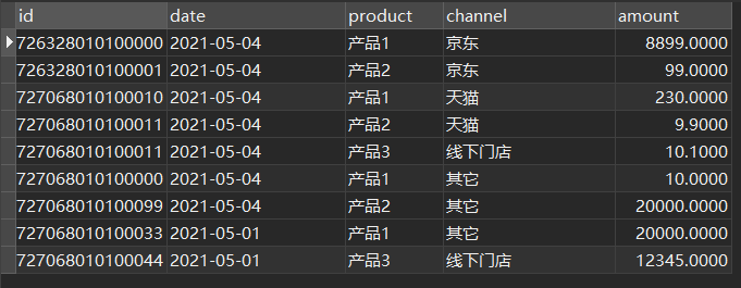 INSERT INTO "report1"("id", "date", "product", "channel", "amount") VALUES ('2105051727068010100044', '2021-05-01', '产品3', '线下门店', '12345');
