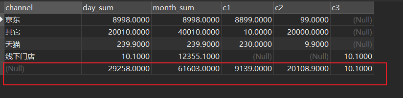 看,匯總的數據已經有了,已經可以算作是最終結果了(如果你需要報表系統來計算匯總行數據的話),當然 ,我們的報表系統過於繁瑣(不是不能做,而是太麻煩),需要你將做好的菜喂給它吃,這時,該怎麽辦呢。。。,哈哈哈 我們似乎忘記了很久不用的rollup函數(一開始我也沒發現有這麽個函數哈哈),試試看吧