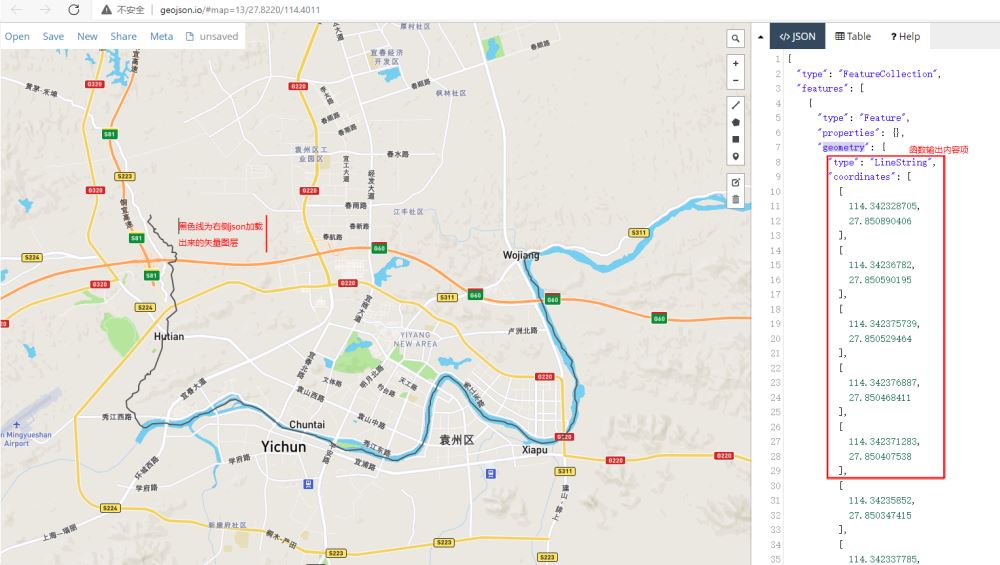 为了验证河流输出结果是否正确,流经河流路径是否连通,可以通过在线geojson地图(geojson.io)呈现出来验证。
