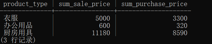 通过下面,得到一个根据商品种类分组的表,并且计算出每个种类的价格的和。