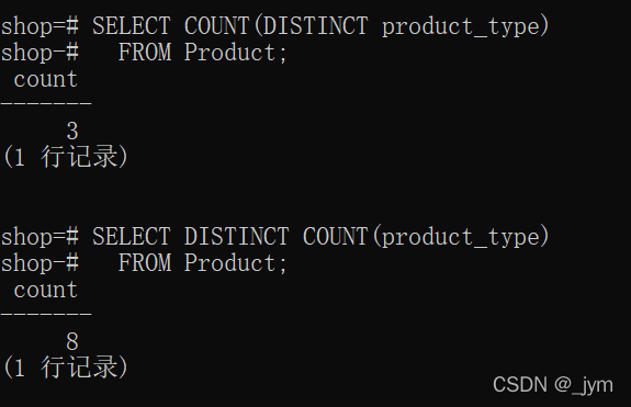 DISTINCT要写在括号中,目的是在计算行数前先去重。