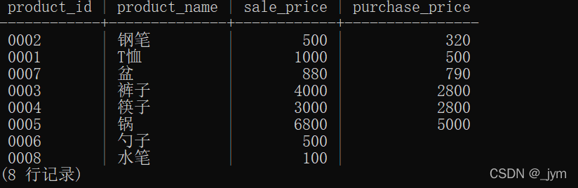 SELECT product_id AS id, product_name, sale_price AS sp, purchase_price