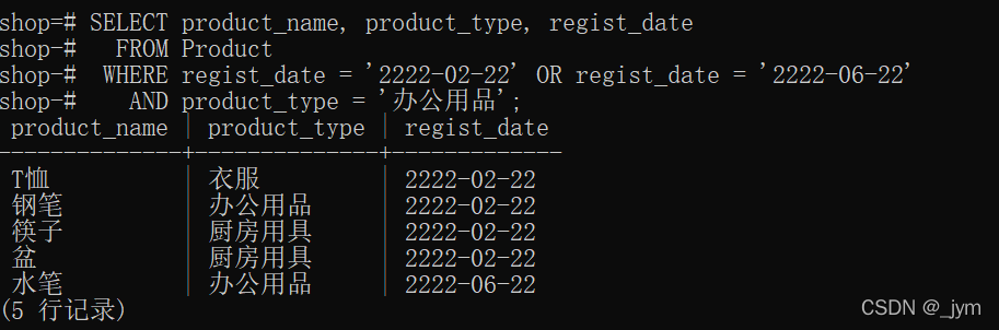 AND运算符的优先级高于OR运算符,如果想要选出product_type = ‘办公用品’,而且登记日期为2222-02-22或2222-06-22,按照下面这个方式是不行的。
