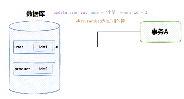 相当于事务A给id为1的数据行加上了排他锁,但是事务并没有执行完也就是说此时事务A持有user表的id为1的排他锁,排他锁的特性就是此时其他事务不能对数据进行删除和修改,因此只有等待事务结束释放锁之后才能重新获取。