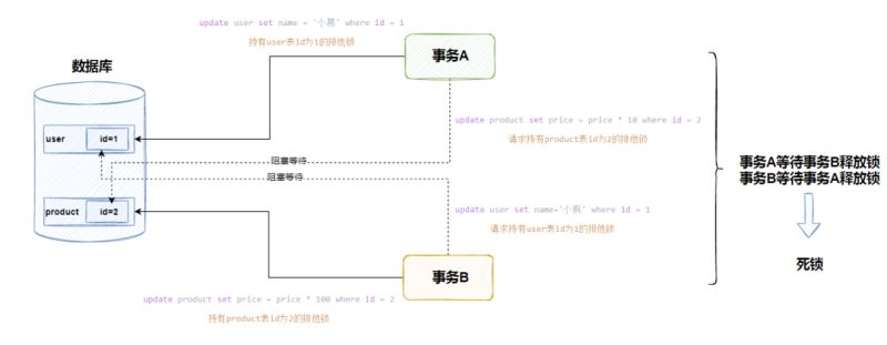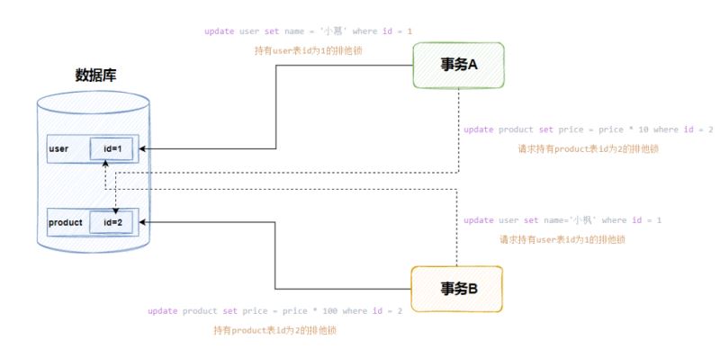 此时事务B执行更新语句获取了product表id为2的排他锁,接着事务B开始执行user表的update语句,需要获取user表的id为1的排他锁。但是此时事务A并未提交,因此事务A持有表user的id为1的排他锁,事务B只有乖乖阻塞等待事务A释放锁。而此时事务A执行update语句,需要获取product的id为2的排他锁,但是此时事务B持有该排他锁,因此也需要等待事务B锁释放。