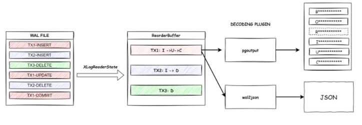 当我们了解了概念之后,来看一下整个解析的工作流程。由于WAL文件里一个事务的内容并不一定是连续的,所以需要通过Reorder后放在buffer中,根据事务ID组织成一条消息,COMMIT后发送给输出插件,输出插件解析后将消息流发送给目标端。