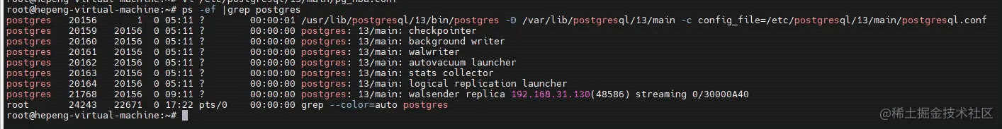 主从搭建后,主库运行状态为: ps -ef|grep postgres