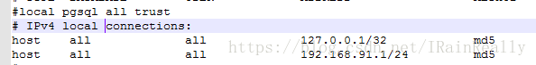 下面添加一行,内容为“host all all 192.168.91.1/24 md5”