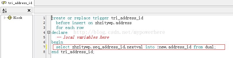 select seq_address_id.nextval into :new.address_id from dual;该触发器在数据库注册了表的侦听,即当指定表address插入记录之前,我们调用序列的nextval获得新值,插入需要自增的字段。
