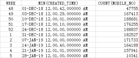 结果如下所示,其中week表示周数。通过MIN(created_time)可以展示出每个自然周的起始日期: