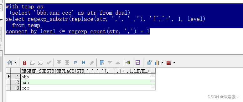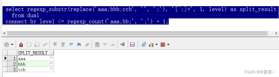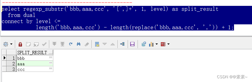select regexp_substr('bbb,aaa,ccc', '[^,]+', 1, level) as split_result