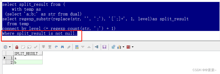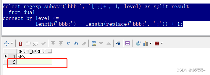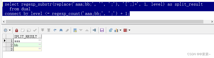 select regexp_substr(replace('aaa;bb;', '', ';'), '[^;]+', 1, level) as split_result