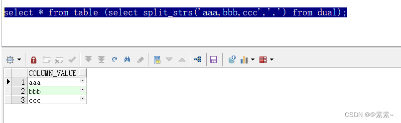 select * from table (select split_strs('aaa,bbb,ccc',',') from dual);