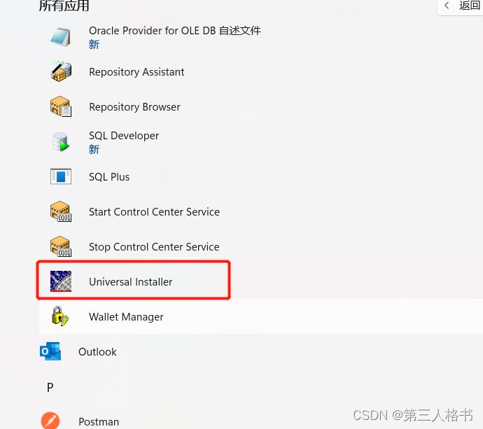 点击开始菜单找到Oracle,然后点击Oracle安装产品,再点击Universal Installer。