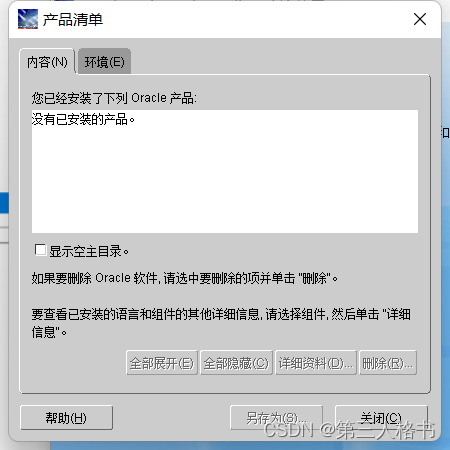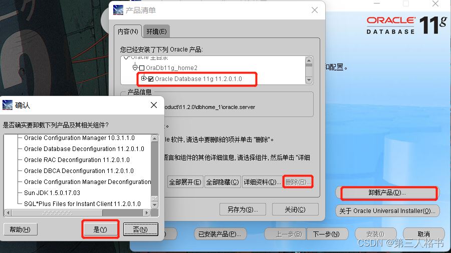 单击“卸载产品”,选中除“OraDb11g_home”外的所有目录,然后点击删除。根据提示,点击下一步完成卸载。