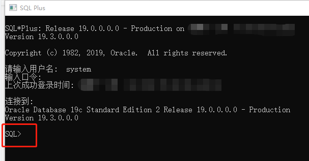 在出现的命令行界面中输入用户名system,密码则是输入安装Oracle时输入的口令。在信息正确输入后,就会显示登录时间、连接信息等,最重要的是出现SQL>字样,就说明登录成功。