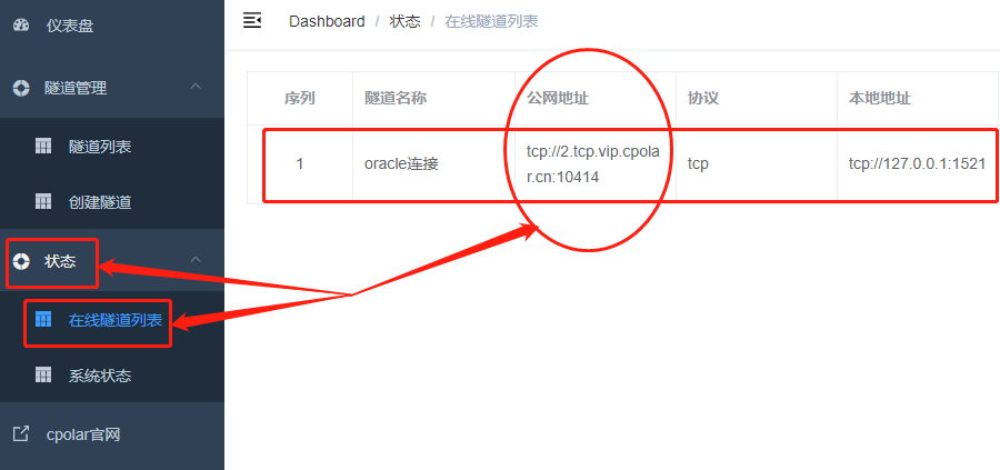 而这条连接本地Oracle数据库的数据隧道的入口(公共互联网地址),则可以在状态项下的在线隧道列表页面看到。我们只要将这个地址粘贴到数据库图形化工具中,就能轻松连入oracle数据库。