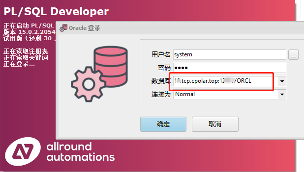 首先在局域网以外的电脑上,打开PLSQL软件,在Oracle登录页面,输入用户名和密码,接下来的数据库栏位,则输入cpolar生成的内网穿透地址(要将tcp://表头去掉),输入完成后,点击确认进行连接。