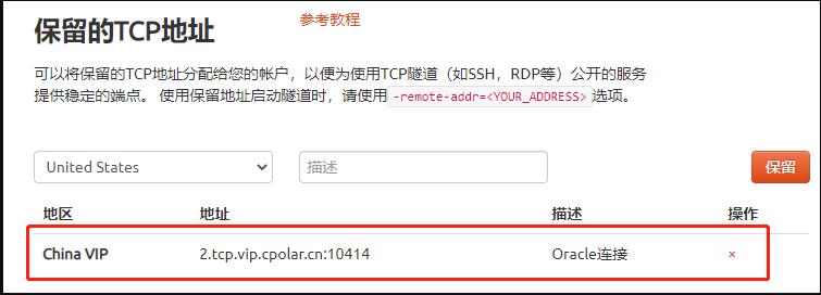 隧道名称 —— 可直接看做数据隧道的备注,用以区分不同隧道的应用场景;协议 —— 即数据隧道的传输协议,如网页、数据传输、设备互联等,这里选择TCP协议;本地地址 —— 这里需要填入软件(或内网设备)的端口号,Oracle的默认端口号为1521,因此此处填入1521;端口类型 —— 也就是这条数据隧道的类型,是否为长期存续的隧道。在cpolar云端设置了保留隧道的,就可以选择“固定TCP端口”;若只是临时使用,则选择“随机临时TCP端口”(需要注意,固定TCP端口要将cpolar升级至专业版及以上);预留的TCP地址 —— 在选择了“固定TCP端口”后就会出现该栏位,这里我们将cpolar云端生成的地址粘贴进来;
