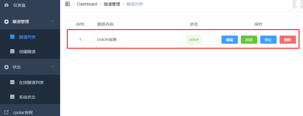 隧道创建成功后,cpolar客户端会自动转入隧道管理项下的隧道列表页面,我们可以在这个页面对已有隧道进行开启、关闭、删除等操作,也能直观的看到数据隧道的工作情况。当然,如果需要对已有的数据隧道信息进行修改,也可以点击对应数据隧道条目的“编辑”按钮进行。