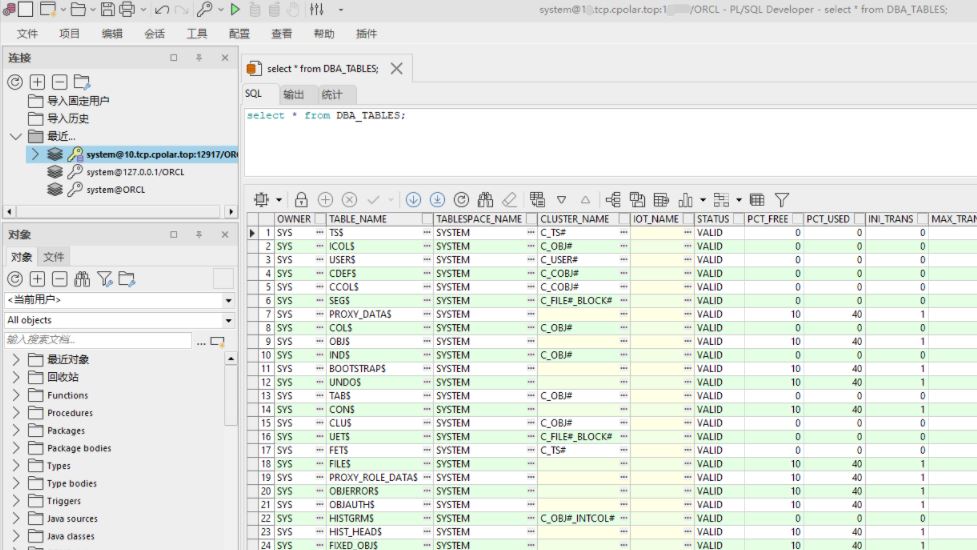 一切顺利的话,很快就能连入Oracle数据库,输入select * from DBA_TABLES查询系统表格,就能出现对应数据,也就说明我们成功的从公共互联网上访问到本地Oracle数据库。