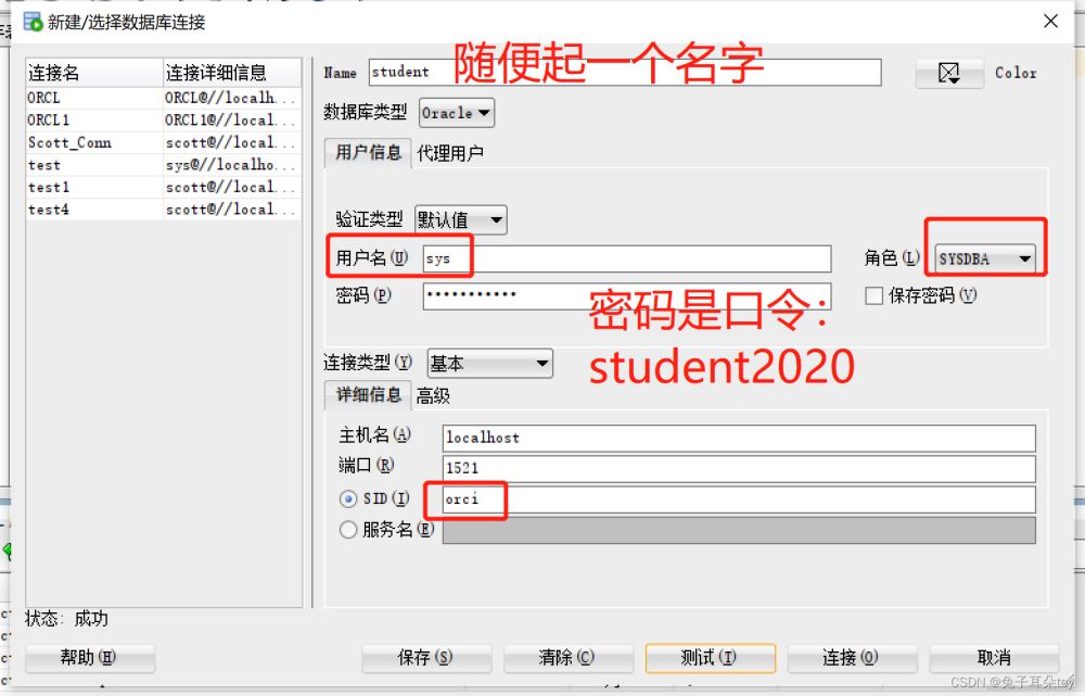 (注:我上面的SID设的是orcw,但是后来我又弄了一个是orci,所以这里连接的时候SID我填的是orci)