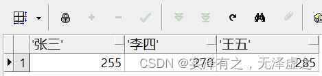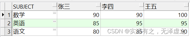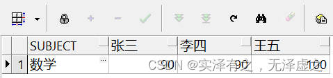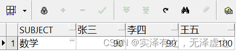 where 张三='90'返回结果如下:按指定科目统计所有学生的最低成绩,并将学生姓名字段行转列,并且只显示数学这一科目的成绩(此时虽然用到了聚合函数max,由于SUBJECT字段也一并显示,因此max函数并没有起到效果,依旧是显示每一个学生的各科具体成绩)。