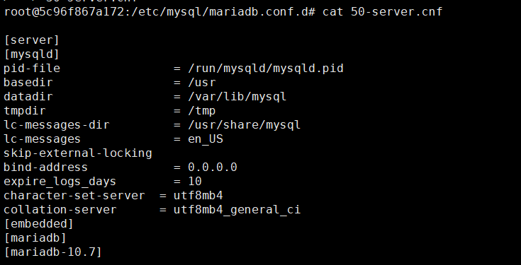 docker run --name mariadbspider -e MYSQL_ROOT_PASSWORD=123456 -p 13309:3306 -d docker.io/library/mariadb:10.7接着,进入每个容器实例中,进入 /etc/mysql/mariadb.conf.d 目录,修改50-server.cnf文件,运行远程访问数据库实例。由于容器中没有 nano、vi 这些编辑命令,因此可以使用下面的命令快速替换文件内容: