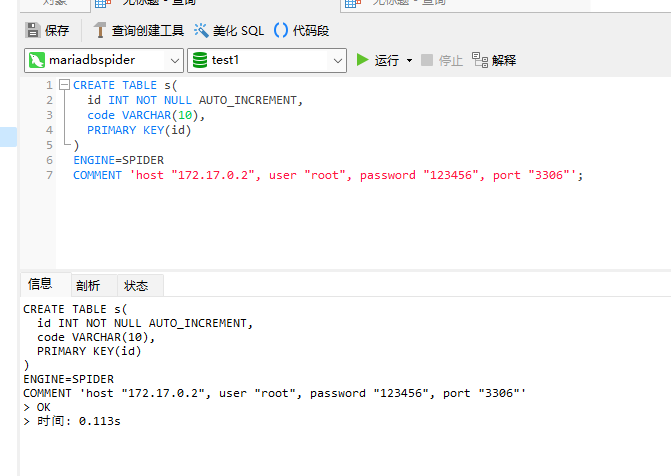 然后在 mariadbspider 实例中,执行命令,创建逻辑表,并将此表通过切片的模式,连接到三个数据库实例中。