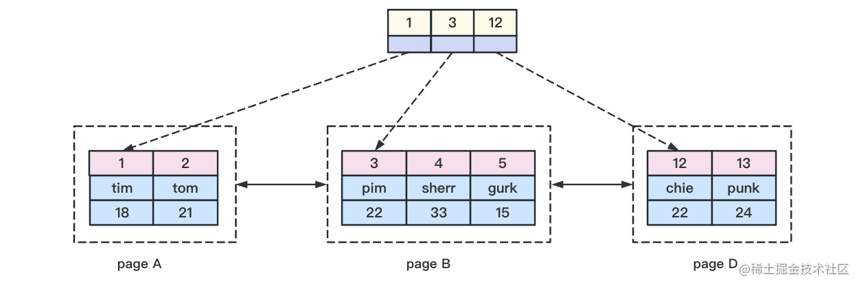 从上图中我们可以看到,最上头是非叶子结点,这种非叶子结点里面存储的是主键id的值,而非叶子结点的内部会有个数据页的指针,这些指针会指向下层的B+树节点,一般B+树的最底层我们称之为叶子结点。在聚簇索引的叶子结点里面,会存储主键id和对应的行记录内容。