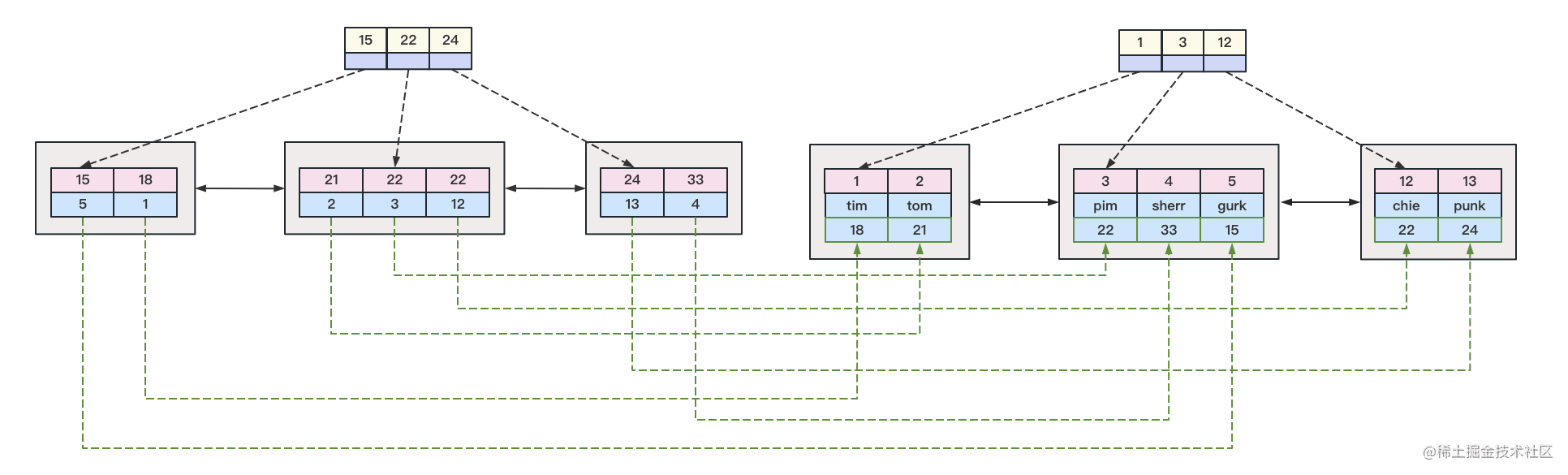 可以看到,在非聚簇索引中,所有的叶子结点都包含了辅助索引的值和主键的值。而当我们要根据辅助索引查询的时候,最终就会通过使用辅助索引定位到具体的叶子结点,最后根据叶子节点里面的主键id去聚簇索引的b+树中检索具体的行记录。