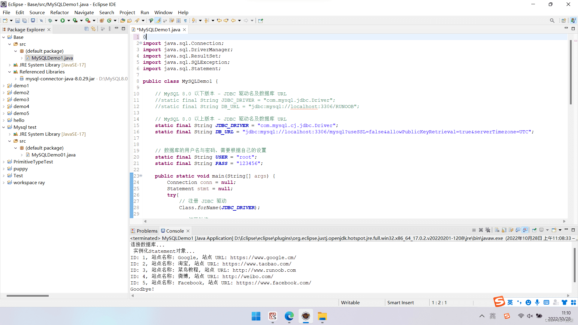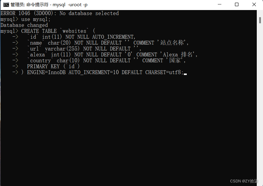 最后,创建数据库来验证以下(该部分参考了菜鸟教程Java部分MySQL的讲解和代码)