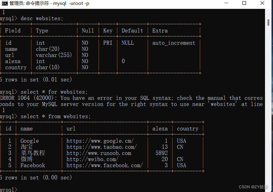 ('5', 'Facebook', 'https://www.facebook.com/', '3', 'USA');(4)查看所创表结构和表的数据