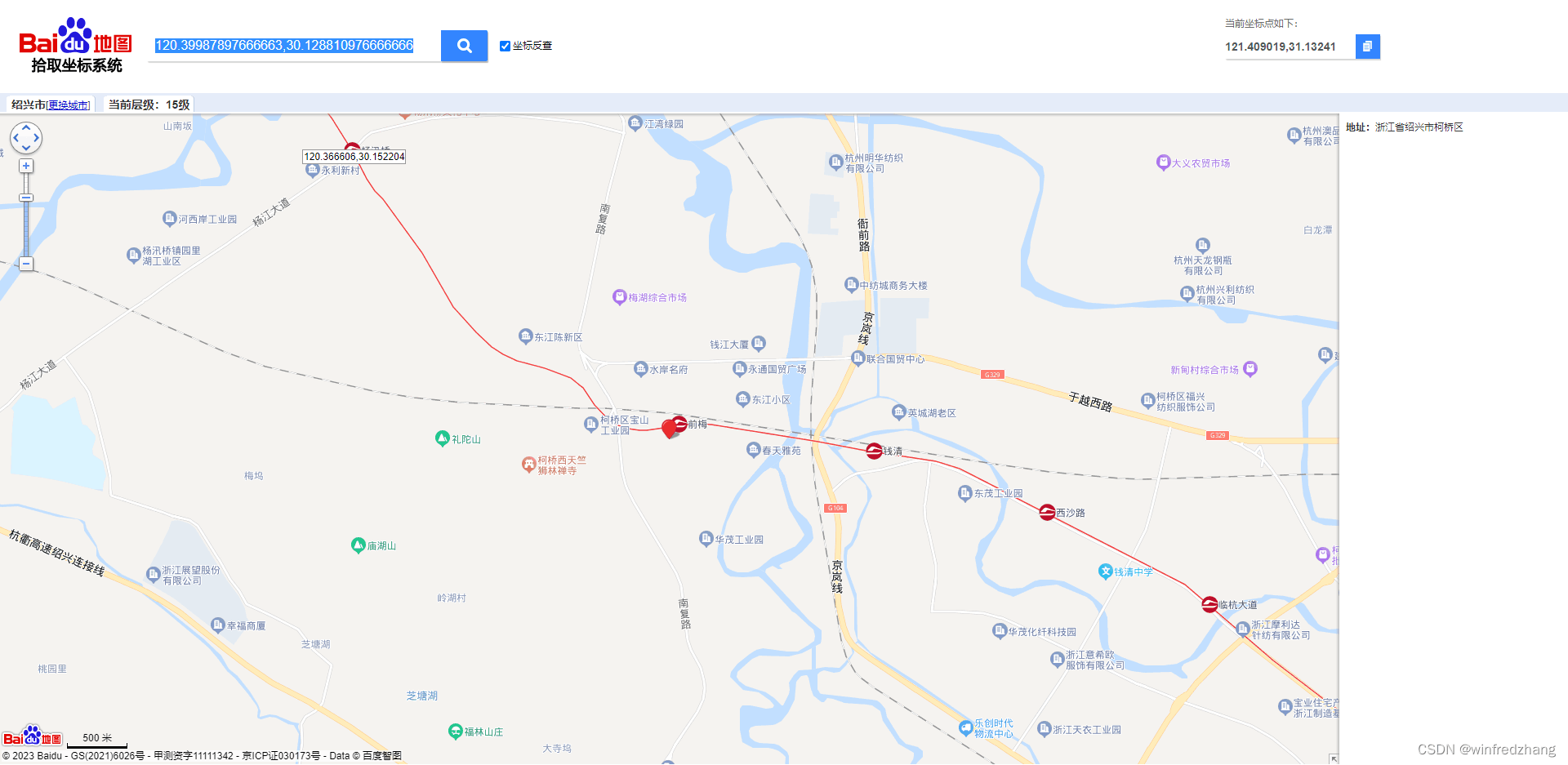 2)输入框中输入:坐标(如:120.39987897666663,30.128810976666666)