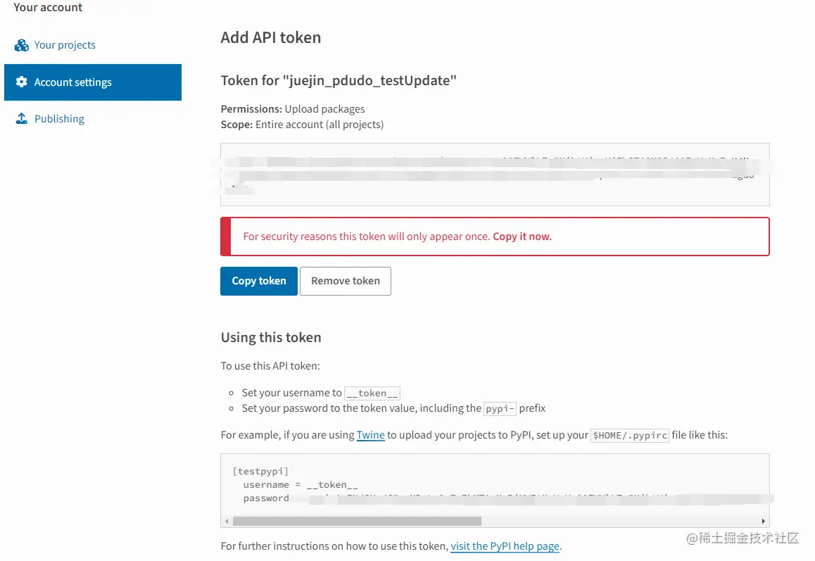 完成后,会得到一个很长的以pypi-开头的token,请记住它,后面要用。
