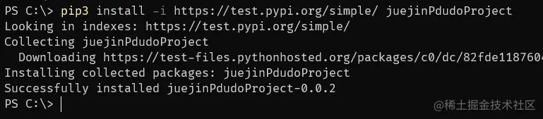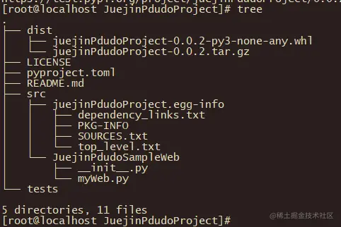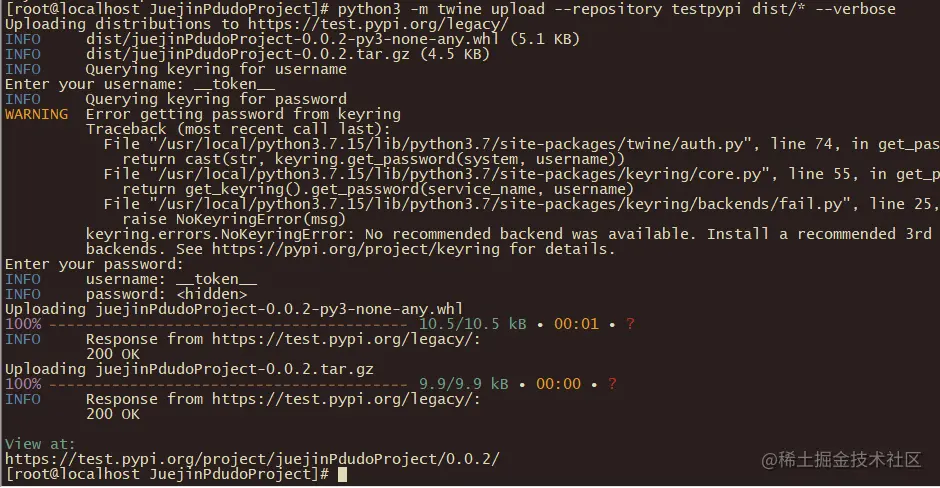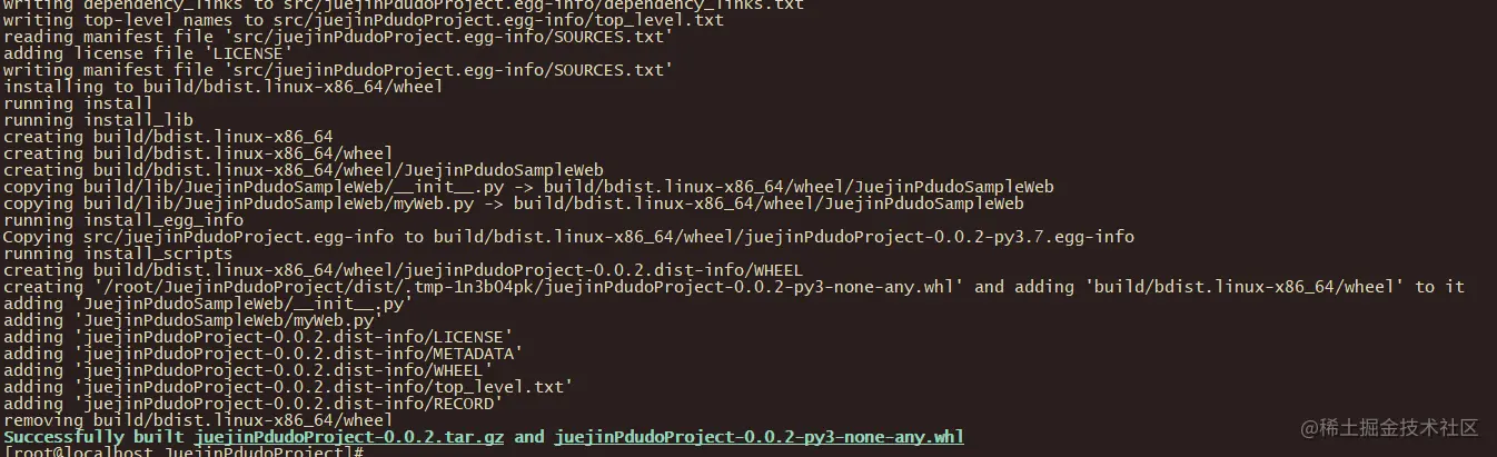 如果成功的话,会出现Successfully built juejinPdudoProject-0.0.2.tar.gz and juejinPdudoProject-0.0.2-py3-none-any.whl类似的信息: