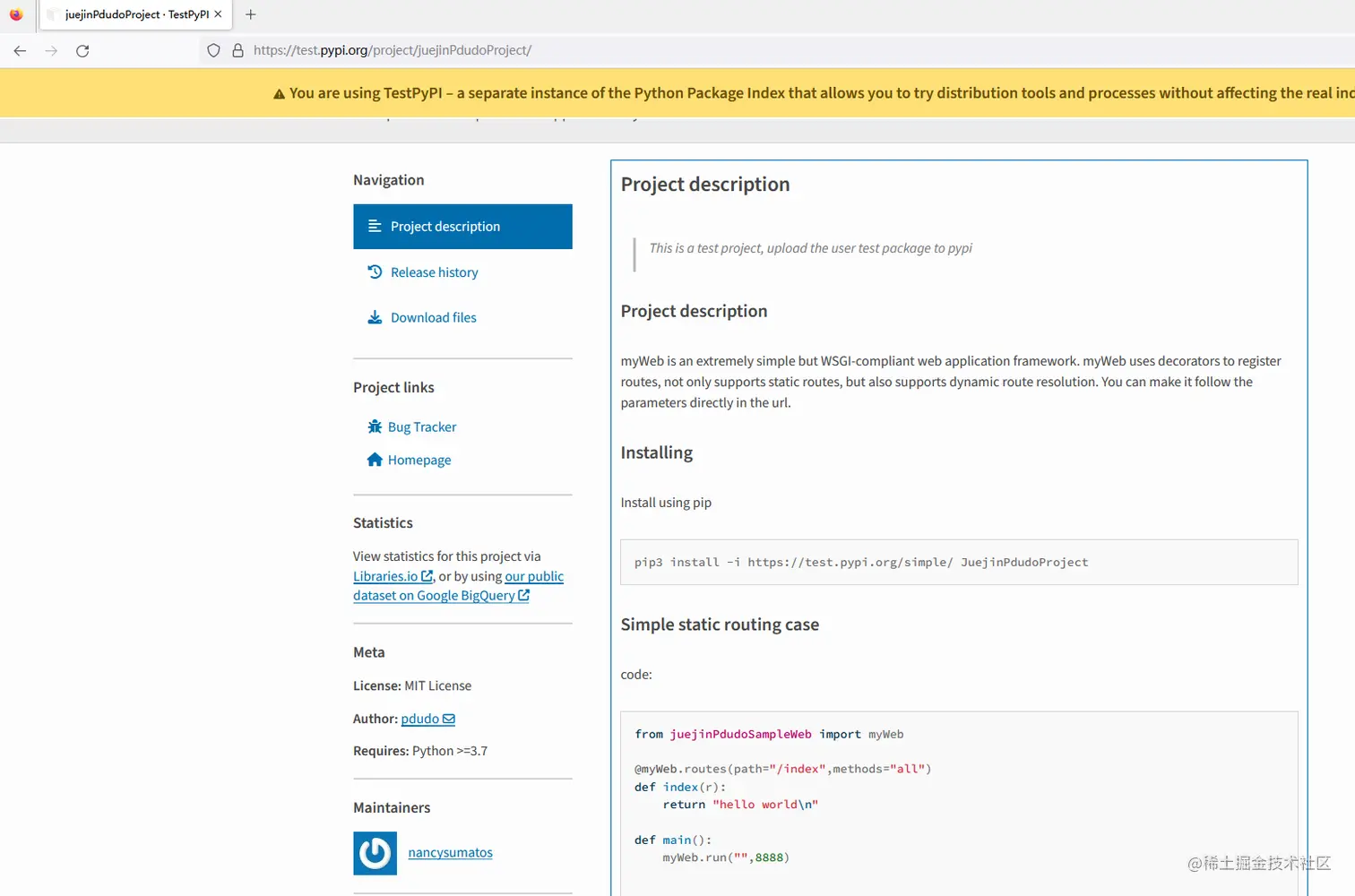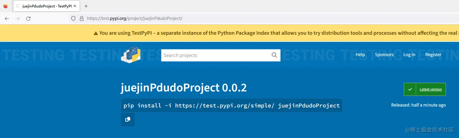 这个就证明上传pypi成功了。此时再打开页面,就可以看到相关内容了: