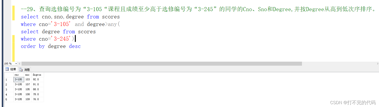 示例:--29、查询选修编号为“3-105“课程且成绩至少高于选修编号为“3-245”的同学的Cno、Sno和Degree,并按Degree从高到低次序排序。