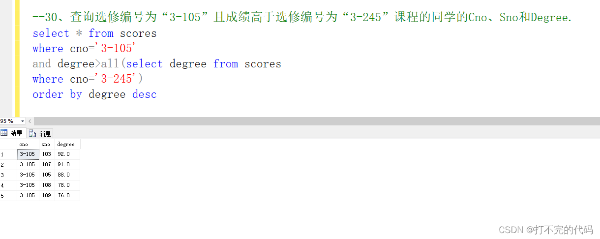 示例:--30、查询选修编号为“3-105”课程且成绩高于选修编号为“3-245”课程的同学的Cno、Sno,Degree.