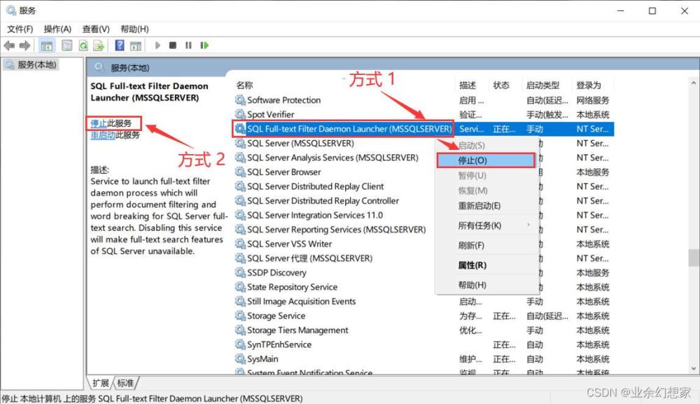找到所有 SQL Server 的服务并全部停止 (不同的版本可能会有区别)