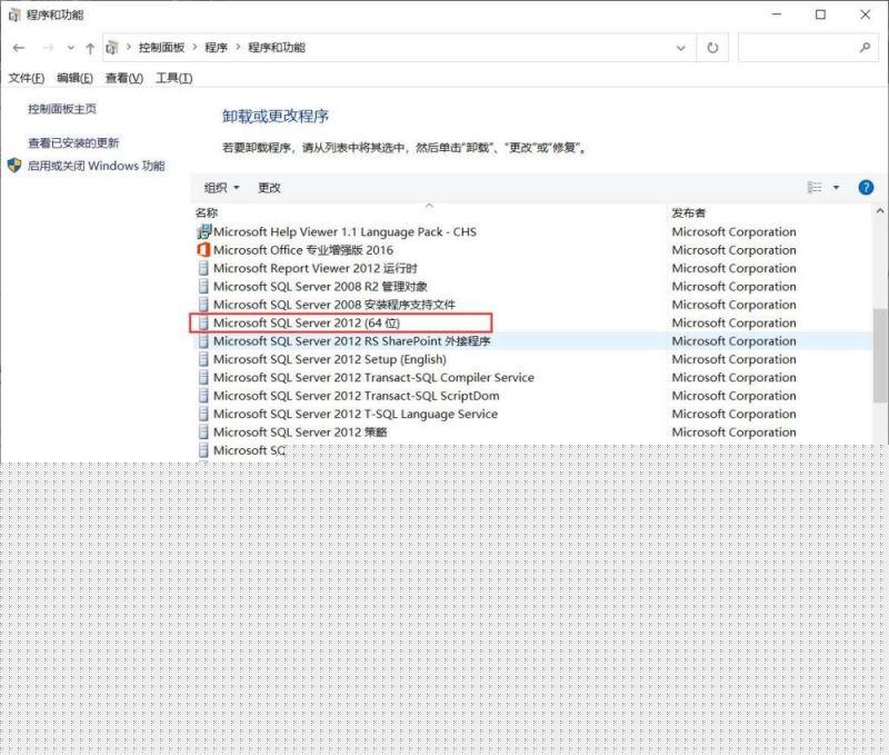 先找到 Microsoft SQL Server 2012(64-bit) 鼠标【右键】-【卸载/更改】(其他版本找到对应的 (64位) 程序,如:SQL Server 2019 就找 Microsoft SQL Server 2019(64-bit))