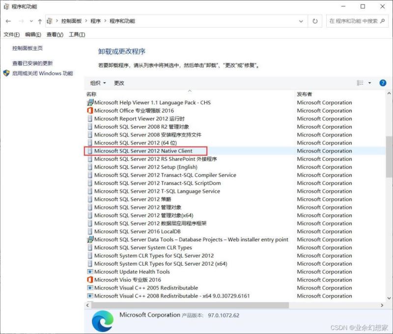 找到 Microsoft SQL Server 2012 Native Client 鼠标【右键】-【卸载】,在弹出的对话框中选择【是】(其他版本找对应的 Native Client 程序,如:SQL Server 2019 就找 Microsoft SQL Server 2019 Native Client)