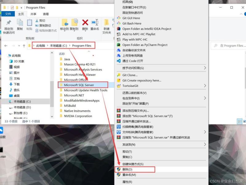 找到自己的之前安装 Microsoft SQL Server 的目录(默认安装的在 C 盘)鼠标【右键】-【删除】,然后进入C:\Program Files 文件夹下,找到 Microsoft SQL Server 文件夹 鼠标【右键】-【删除】