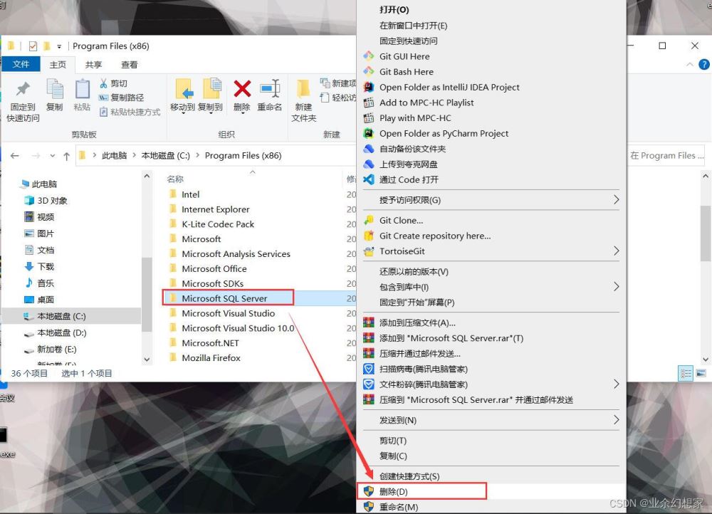 进入 C:\Program Files (x86) 文件夹下,找到 Microsoft SQL Server 文件夹,鼠标【右键】-【删除】