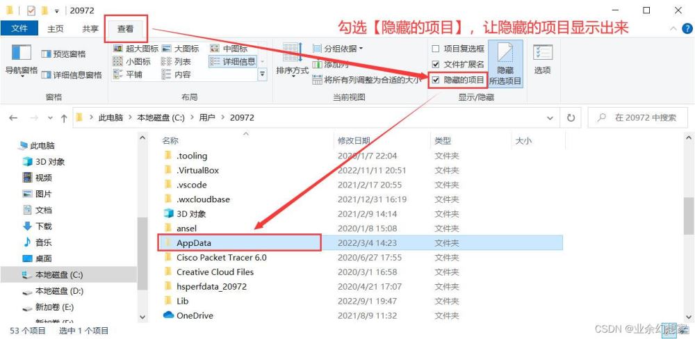 注:因为 AppData 是一个隐藏的文件,所以需要显示隐藏的项目,就按照下面的操作就可以找到了